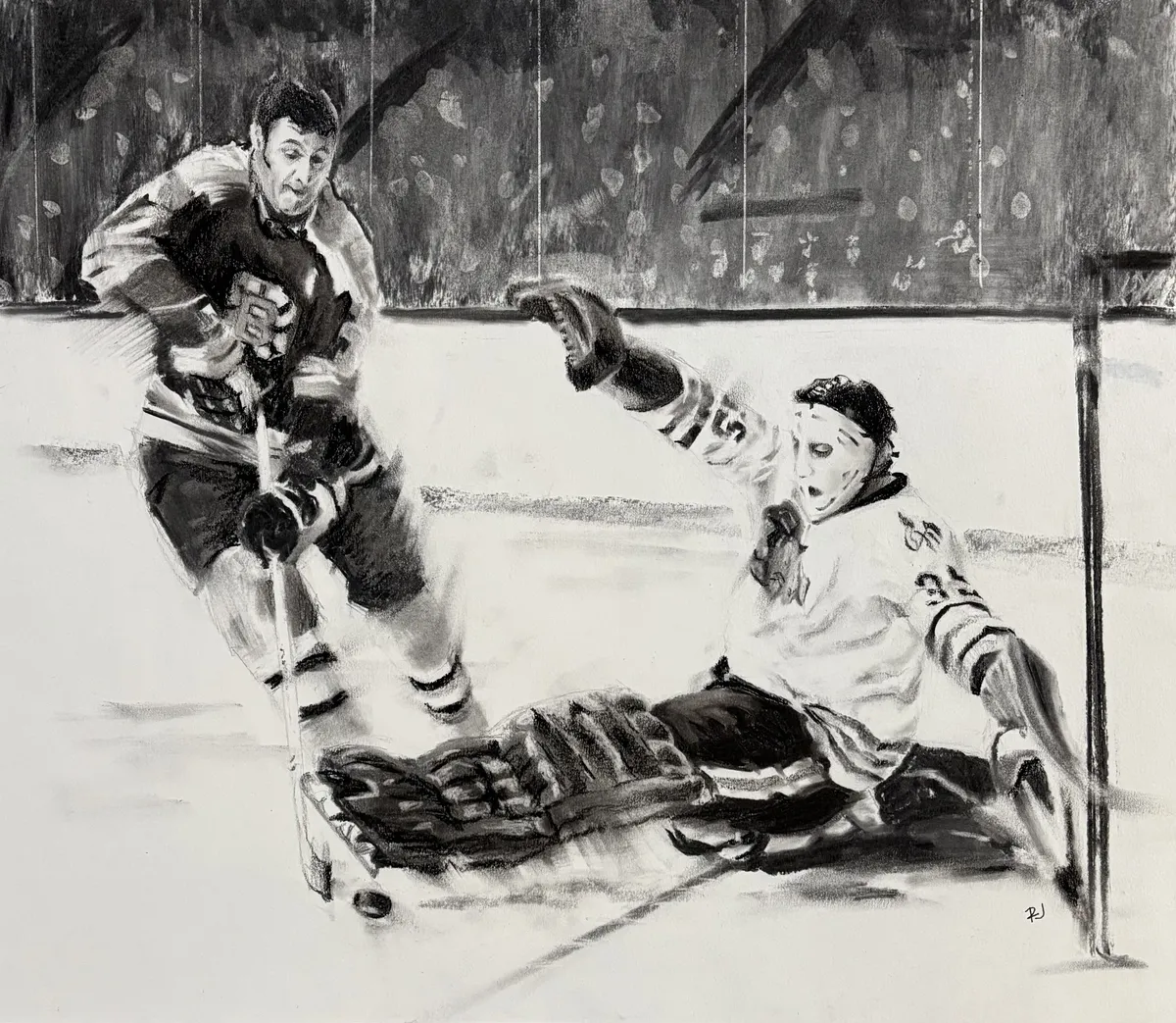Phil Esposito trying to score on brother Tony